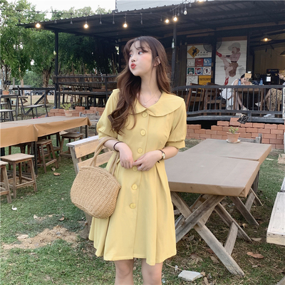 Real price ~ Korean version baby collar show thin A-line skirt single breasted pleated Short Sleeve Dress