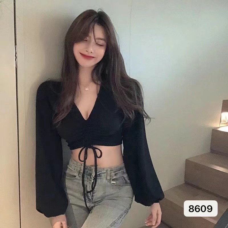 2021春秋网红港风针织女ins露脐内搭显瘦长袖打底衫抽绳v领上衣潮