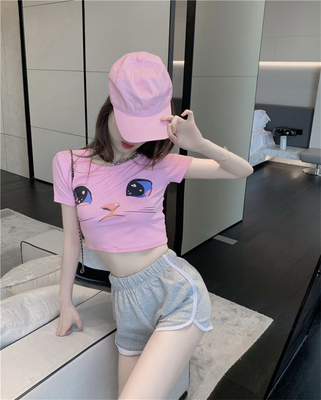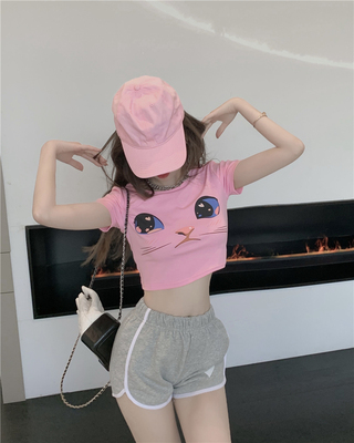 Real price cute cat face navel exposed short sleeve T-shirt + embroidered love sports contrast Shorts Set