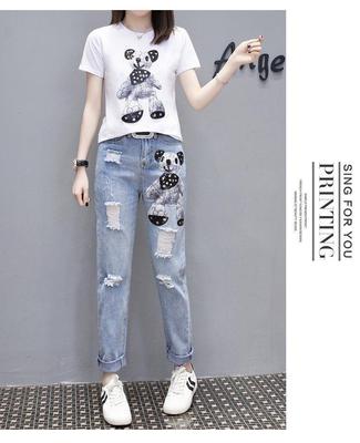 Net red same summer new cartoon T-shirt, short sleeve top + holed jeans, nine point suit