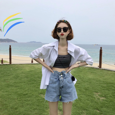Real-price Korean version of high waist and slim three-grain button wool edge washed jeans shorts and hot pants