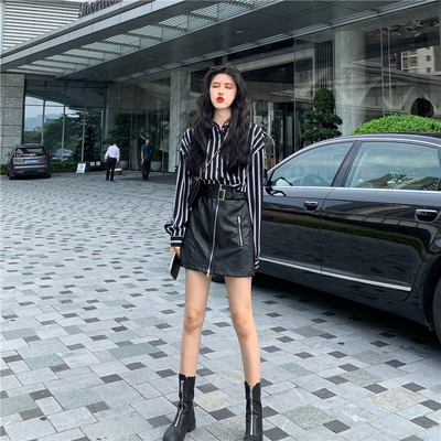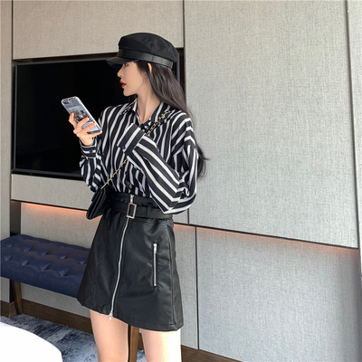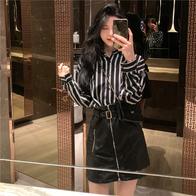 Real-price striped shirt with long sleeves and high waist zipper half-length skirt