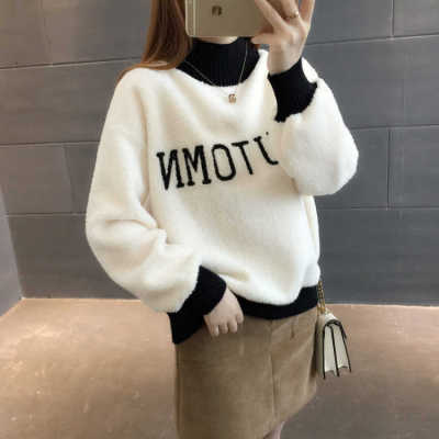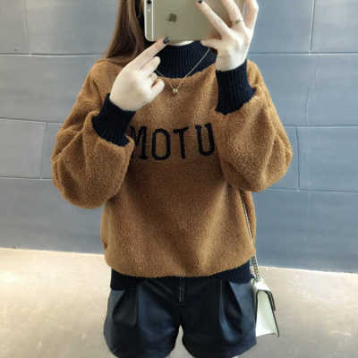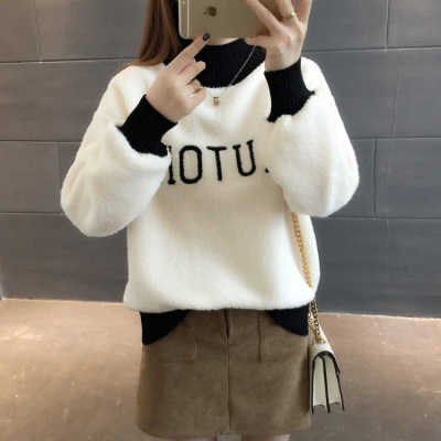Fluffy and plush long sleeve coat for women's autumn and winter women's half high collar loose letter Pullover for women