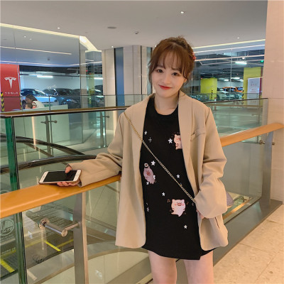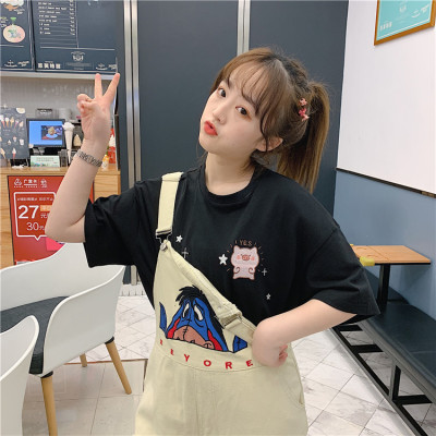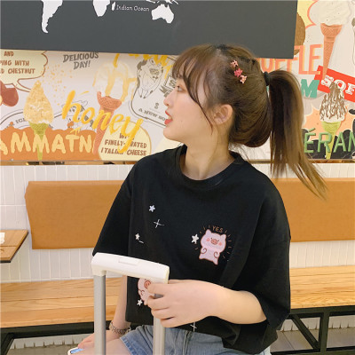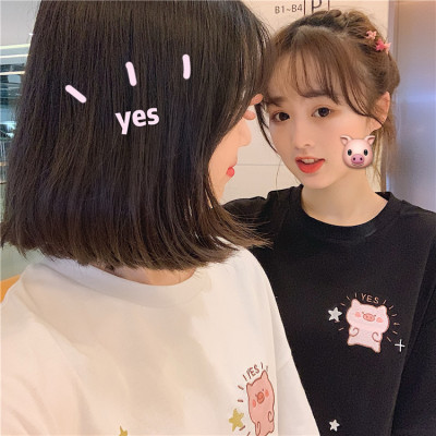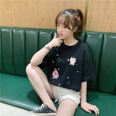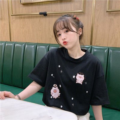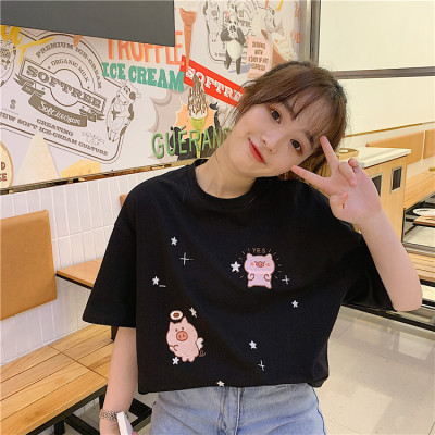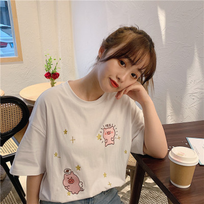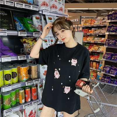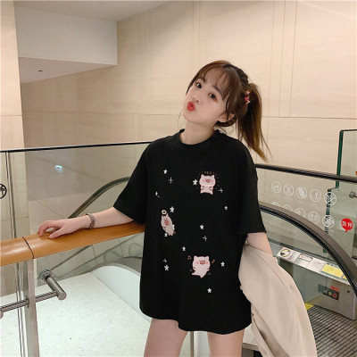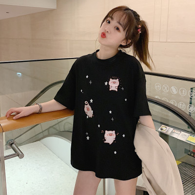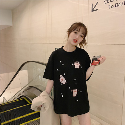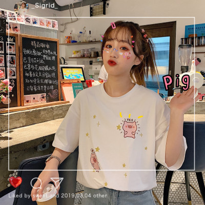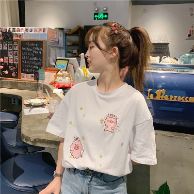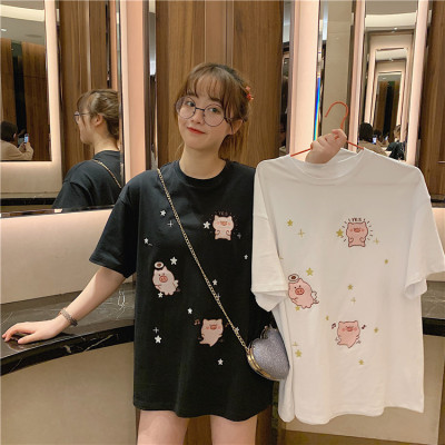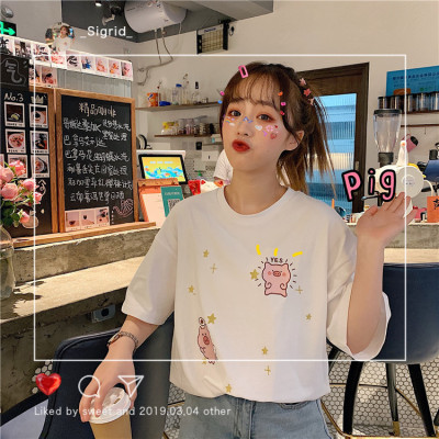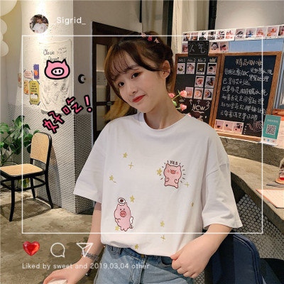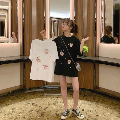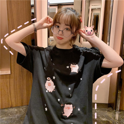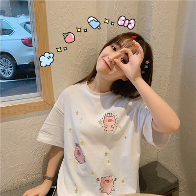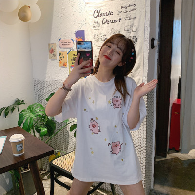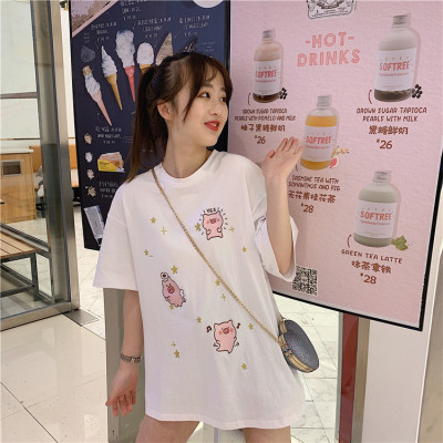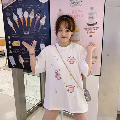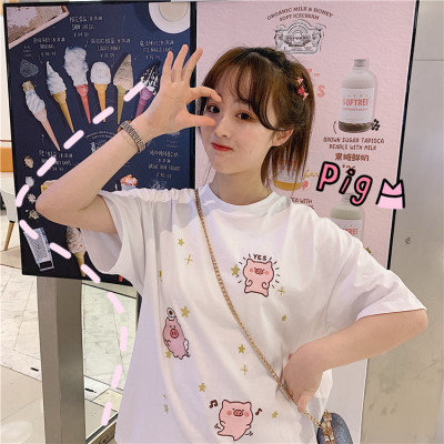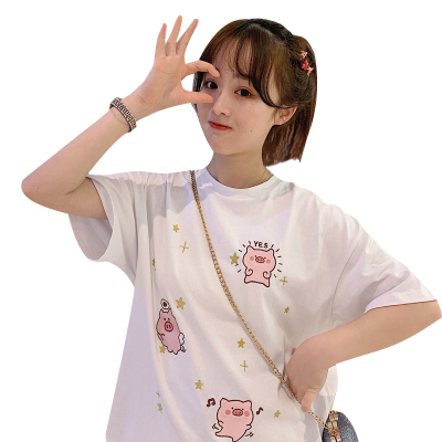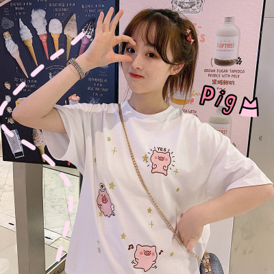 Korean loose pig printed short sleeve T-shirt women's net red white top student medium long bottoming shirt