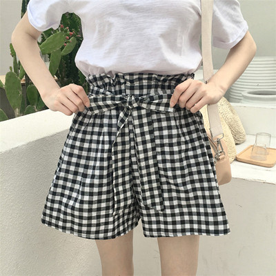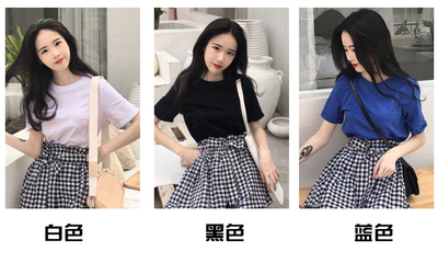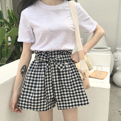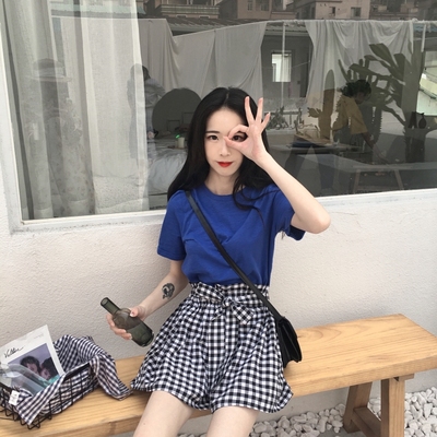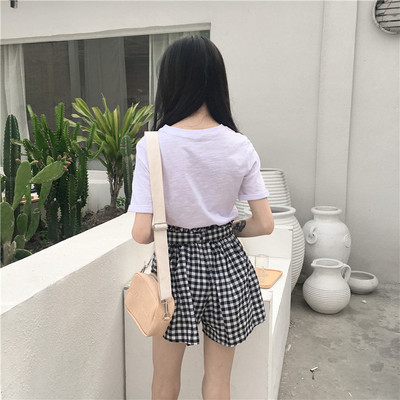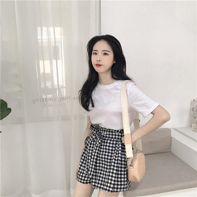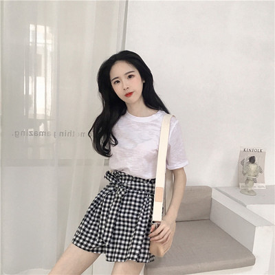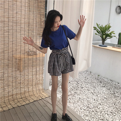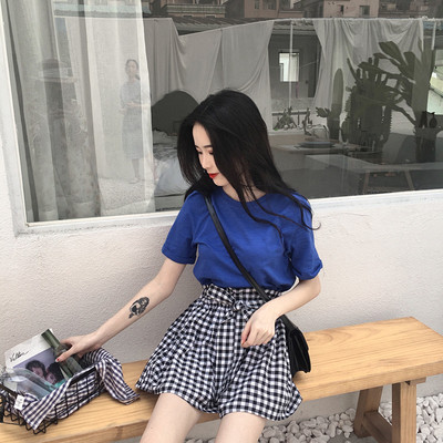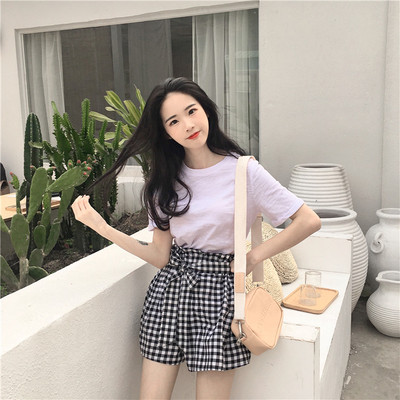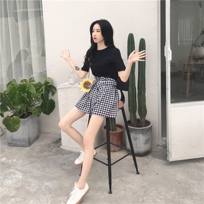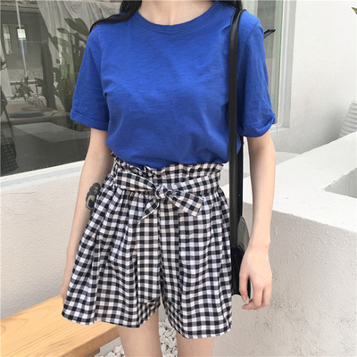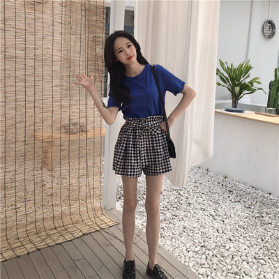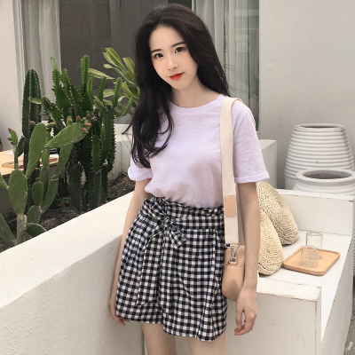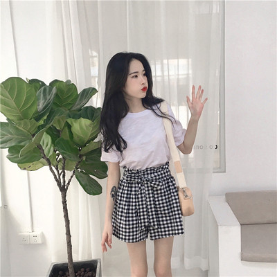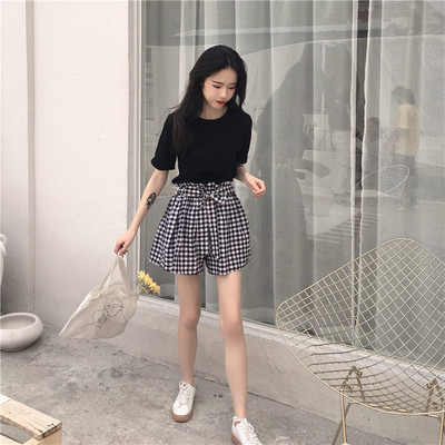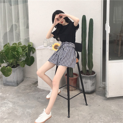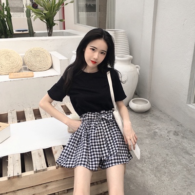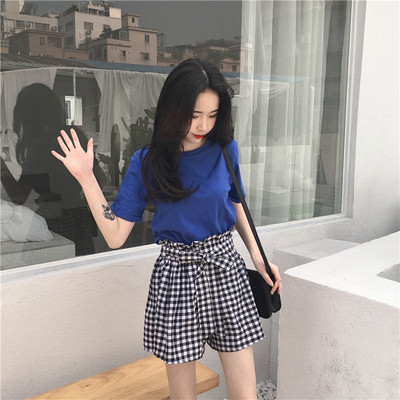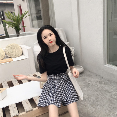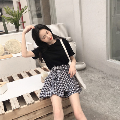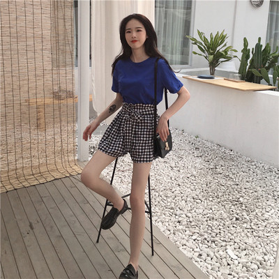 Single T-shirt yuan can be matched with T-shirt round neck short sleeve shorts two piece Plaid Wide Leg Pants Set
