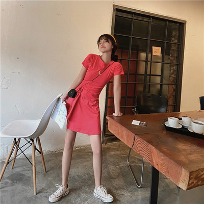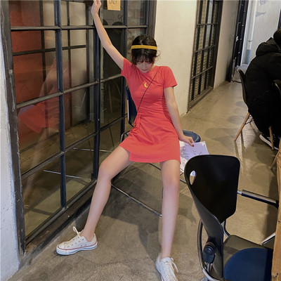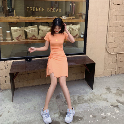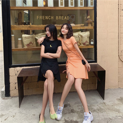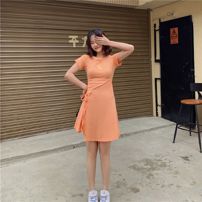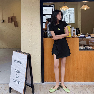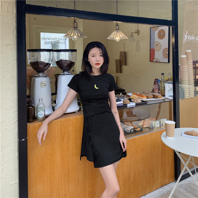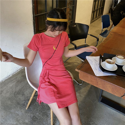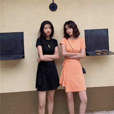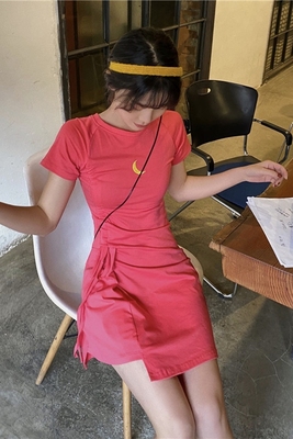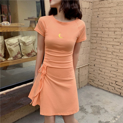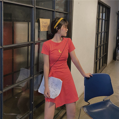 Real photo real price crescent print dress women's new summer slim waist style drawstring skirt