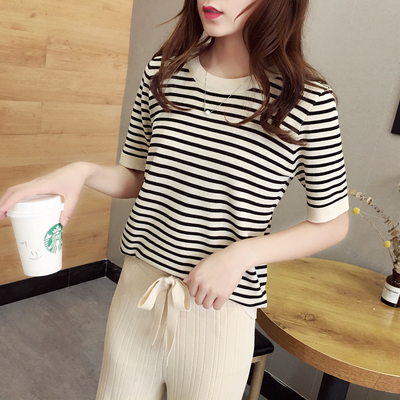 Women's spring and autumn new net red short sleeve stripe knitted top two pieces for leisure