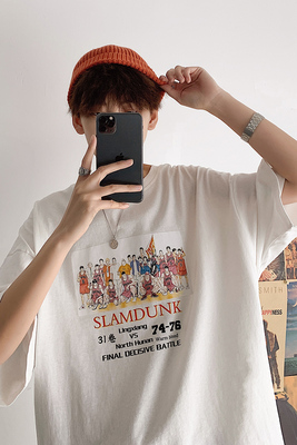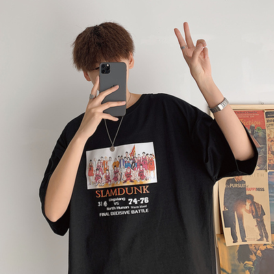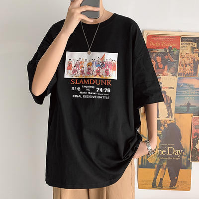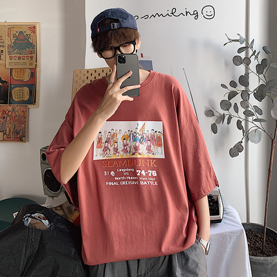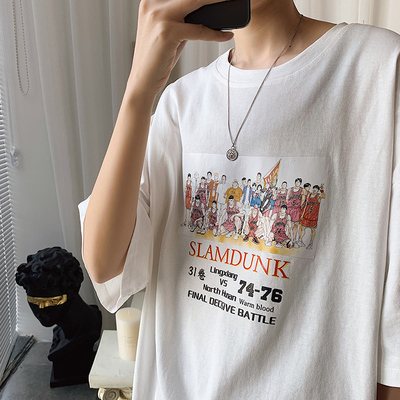 Summer 2020 new loose white print five sleeve t-shirt men's Hong Kong Style half sleeve T-shirt with short sleeve trend