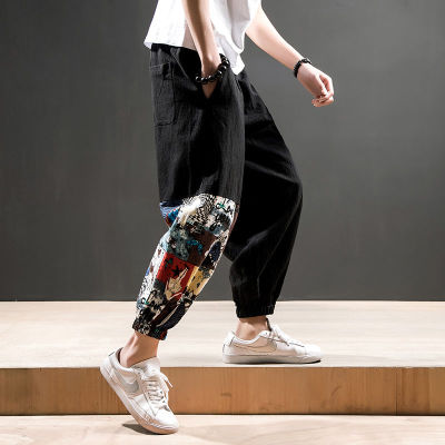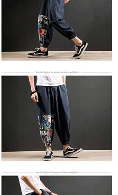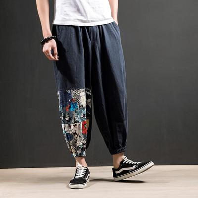 Cropped pants men's autumn cotton hemp Harun Pants Plus fat plus size loose 8 cropped pants trend hiphop pants men