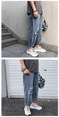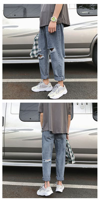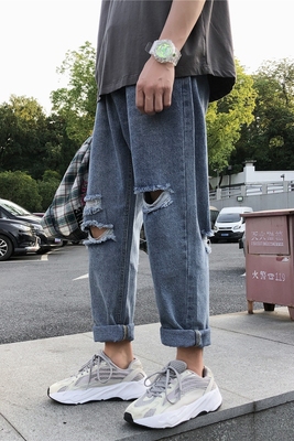 Boys' pants ins original night trend jeans Korean loose straight beggars' pants summer ripped cropped pants