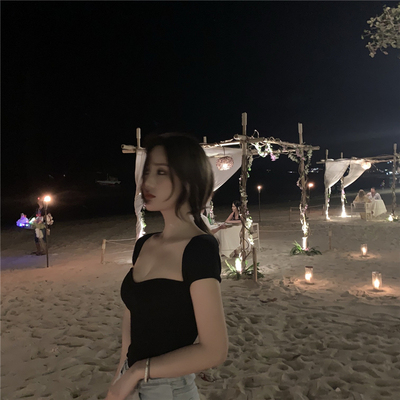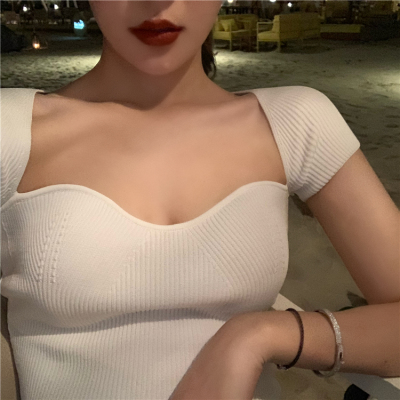 Real photo real price summer new sexy arc neckline knitwear short open navel short sleeve top