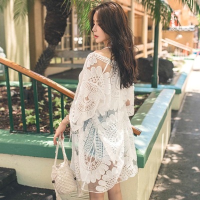 Sexy new embroidery lace mesh loose seven sleeve medium length cardigan women's sun suit Beach Hot Spring Holiday