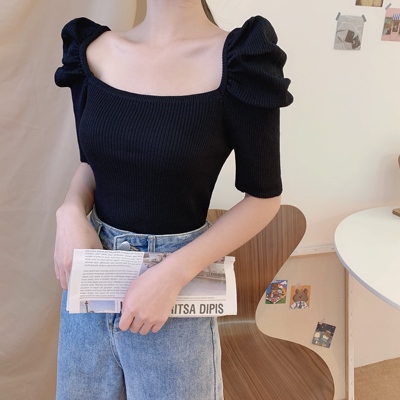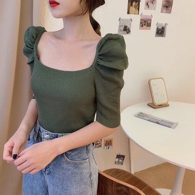 Real photo real price retro square neck slim bubble sleeve collar knitted shirt