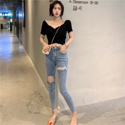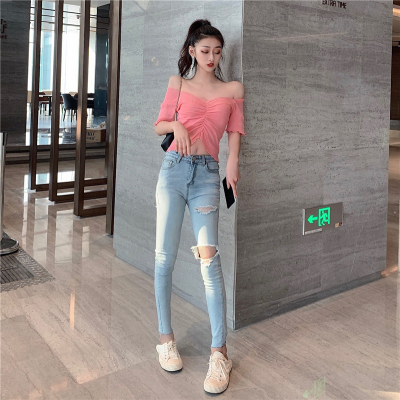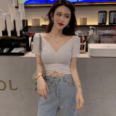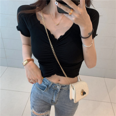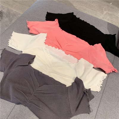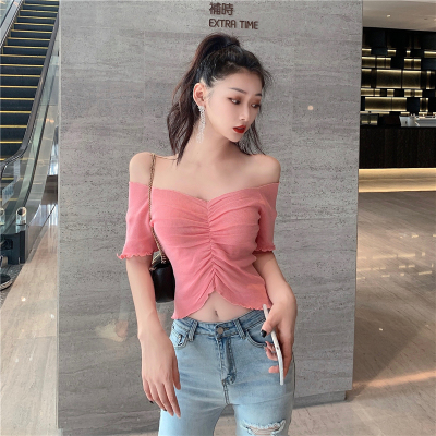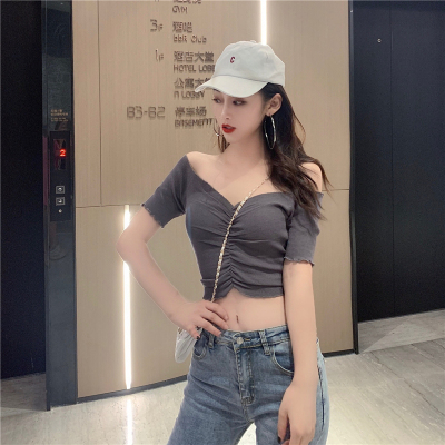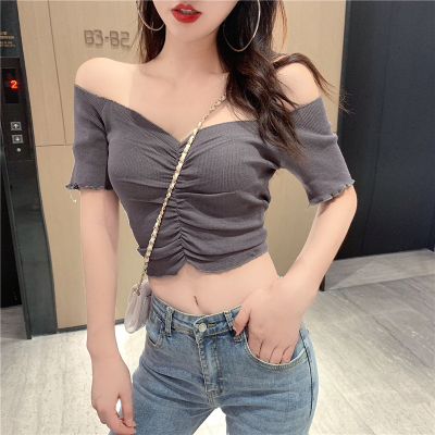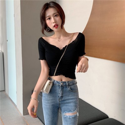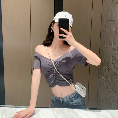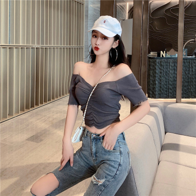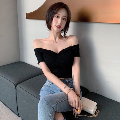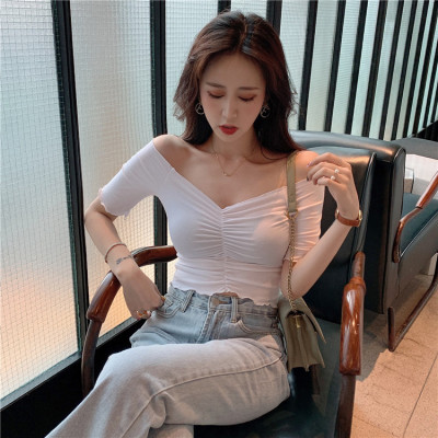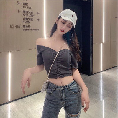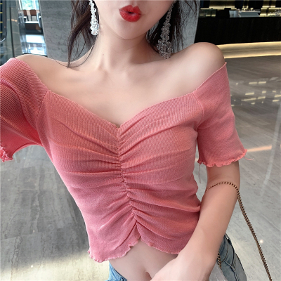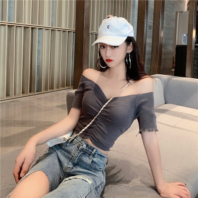 Summer 2020 new net red small man wear careful machine clavicle one shoulder wrinkle knitted bottoming T-shirt