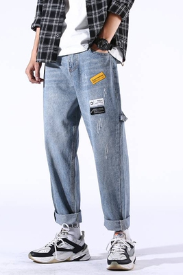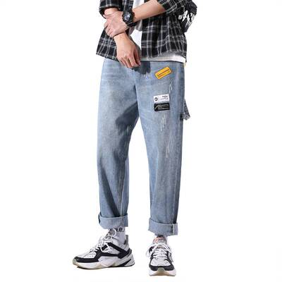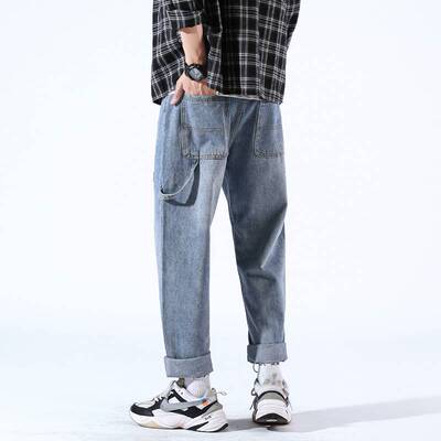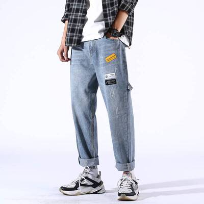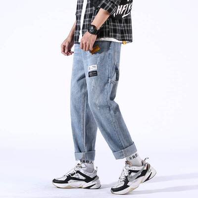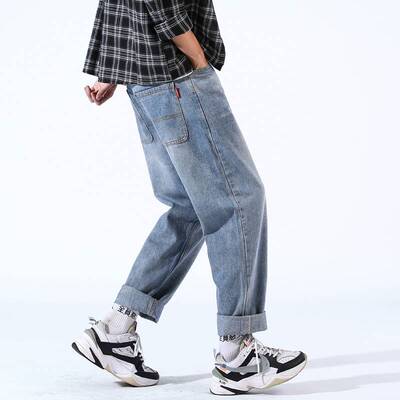 Loose jeans men's straight tube spring trend Pai 9 points casual long pants men's pants Korean trend all over wide legs