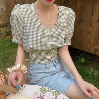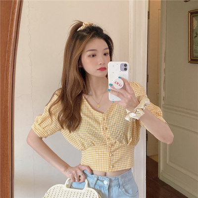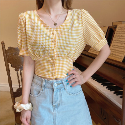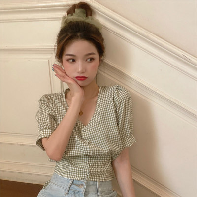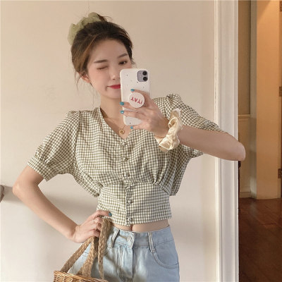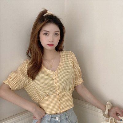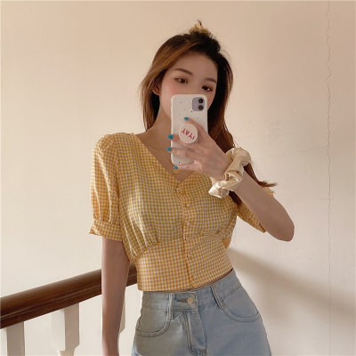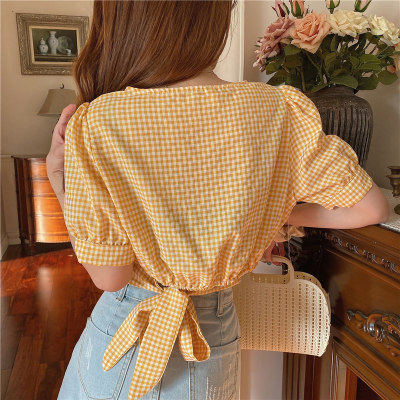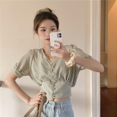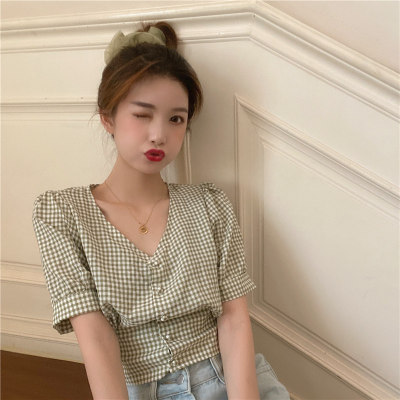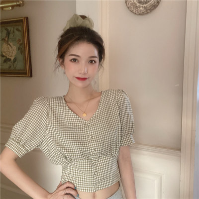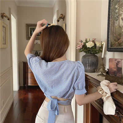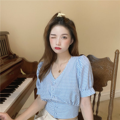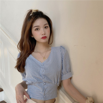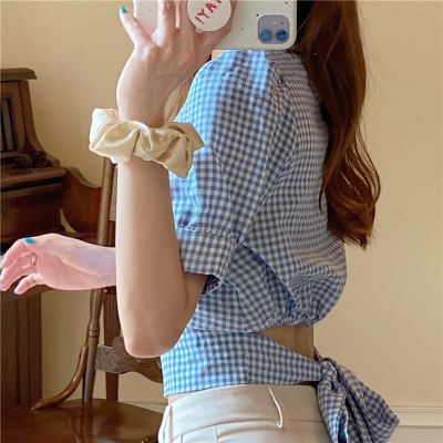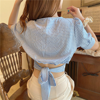 Real photo, real price, Korean version, small fresh plaid, mix and match, thin top, short style, dew, back strap, V-neck shirt, female