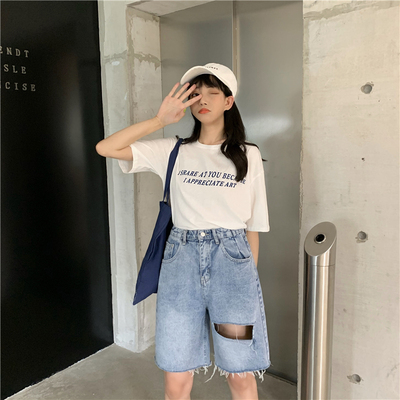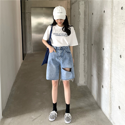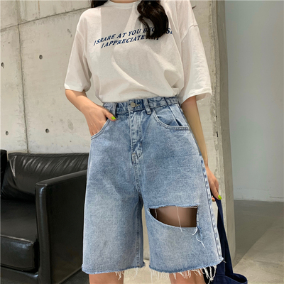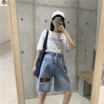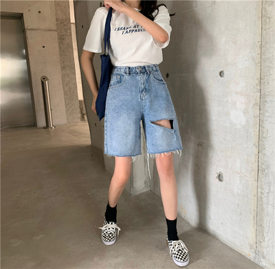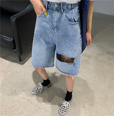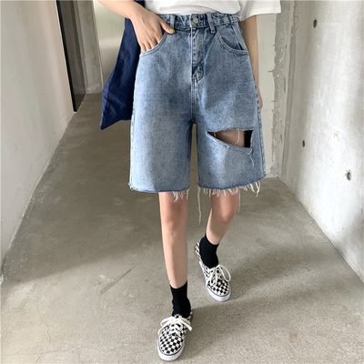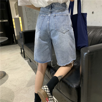 Real shot real price hole five point pants loose straight leg wide leg high waist Hong Kong Style burr denim pants