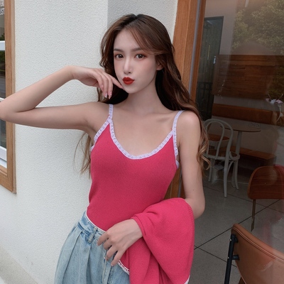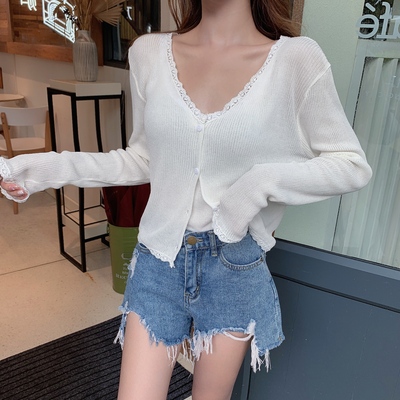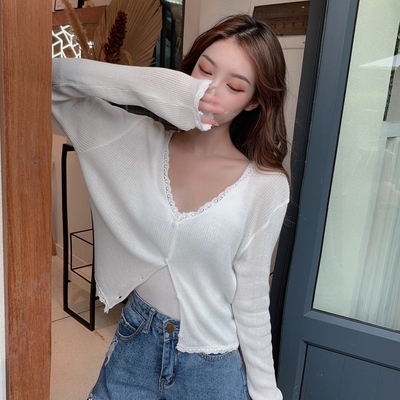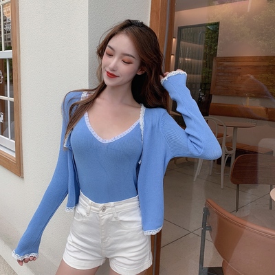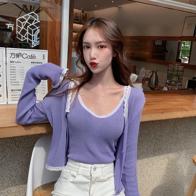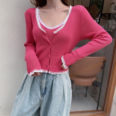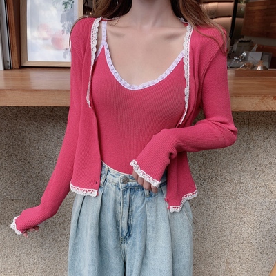 Real photo real price ~ French lace splicing net red cardigan two piece top thin long sleeve knitwear woman