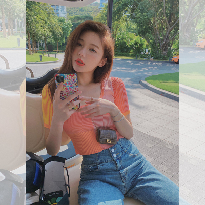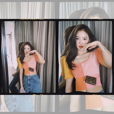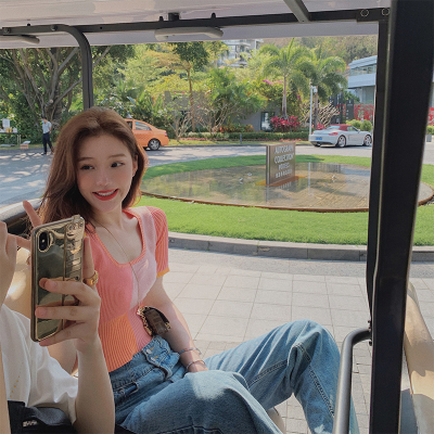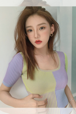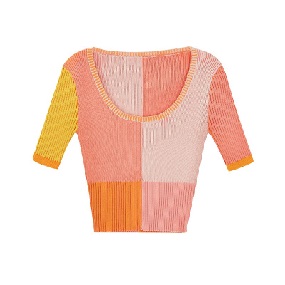 Beautiful summer wear right angle shoulder Hong Kong retro contrast cool and breathable knitted short sleeve T-shirt for women