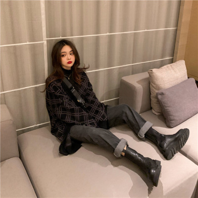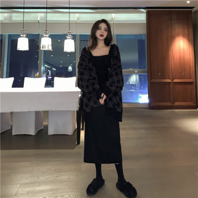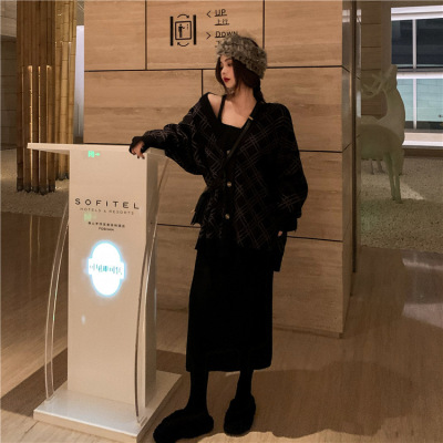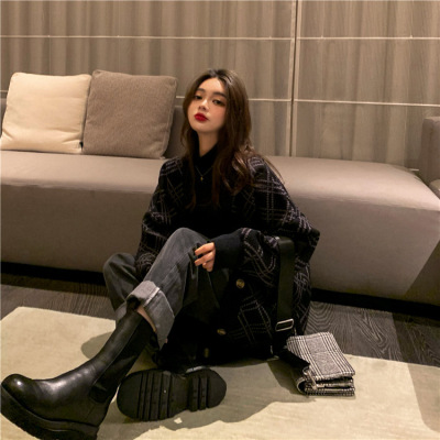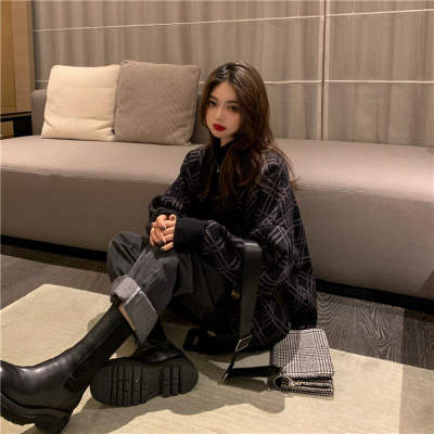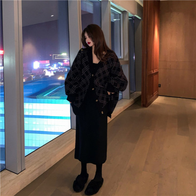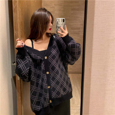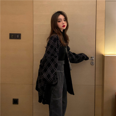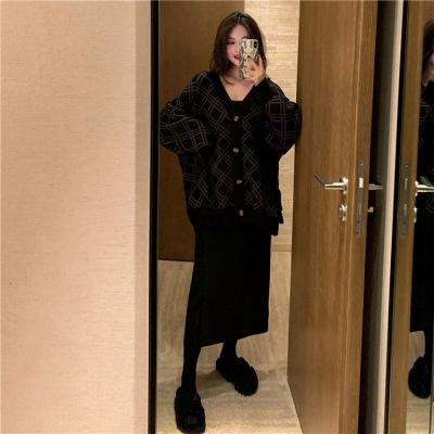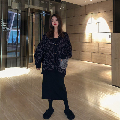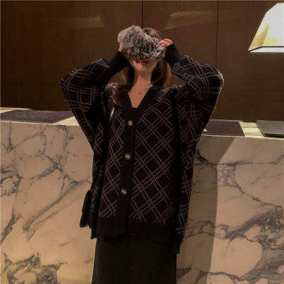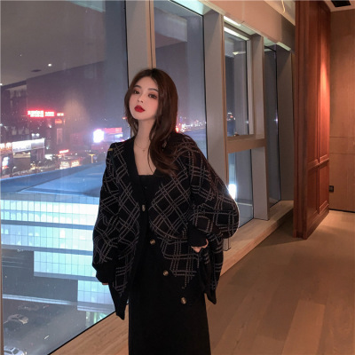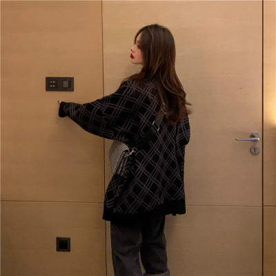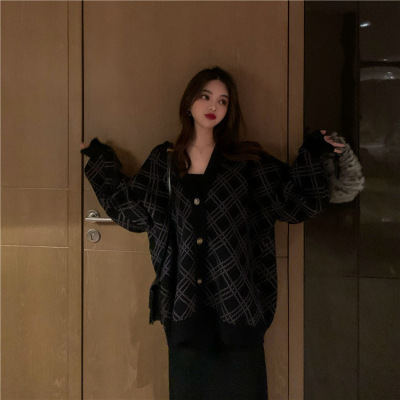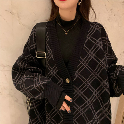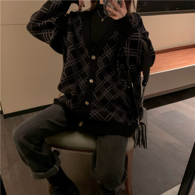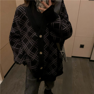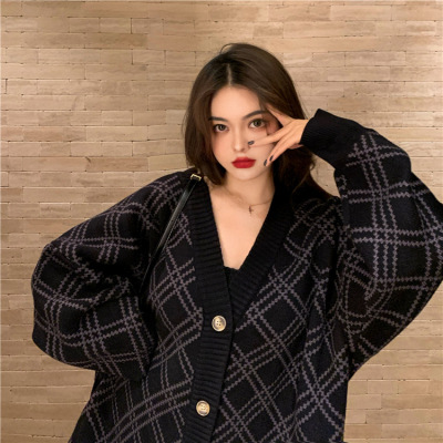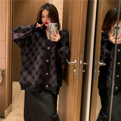 2020 Hong Kong style new loose V-neck Lingge sweater coat women's medium length black knitted cardigan top