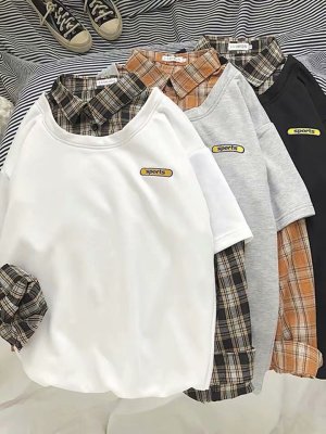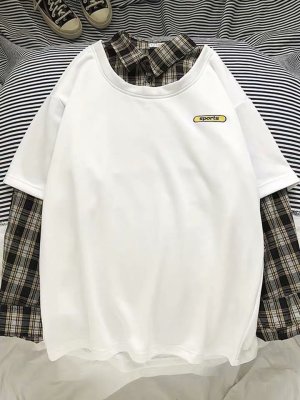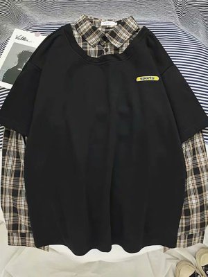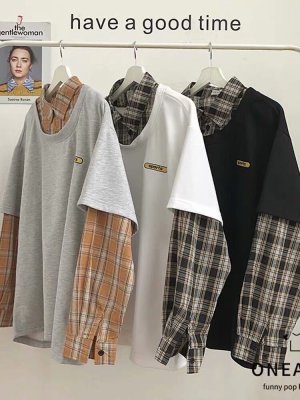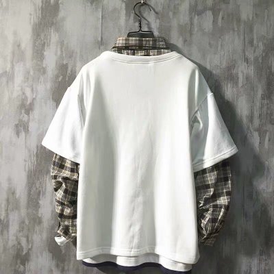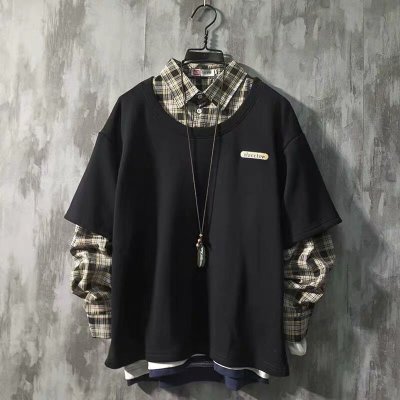 Net red spring Japanese Korean loose Plaid Shirt Men's long sleeve fake two shirt ruffian handsome fashion sweater coat