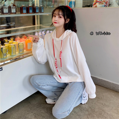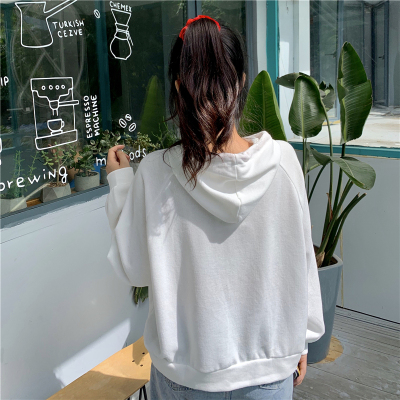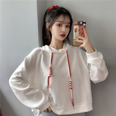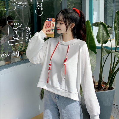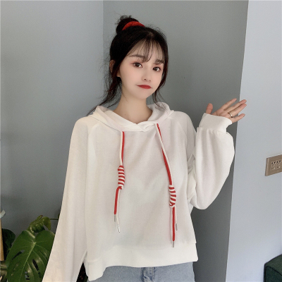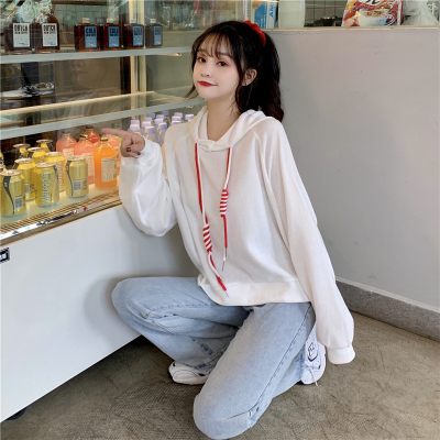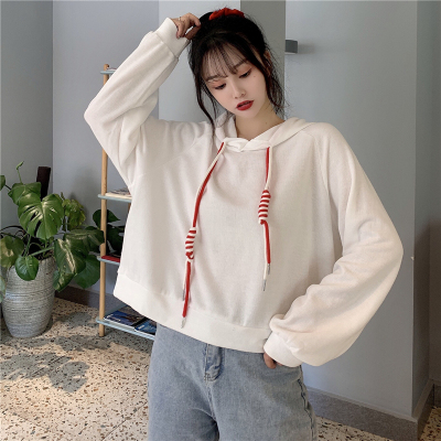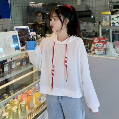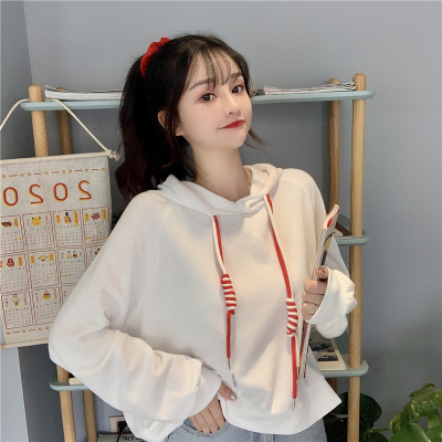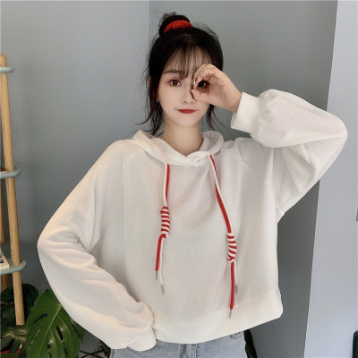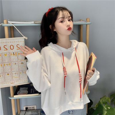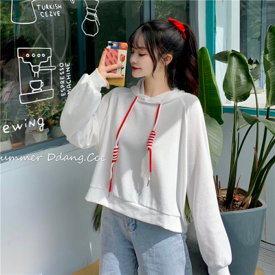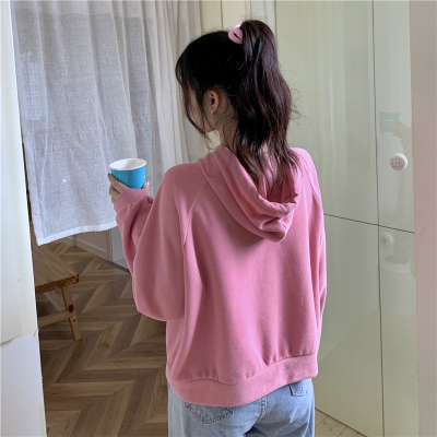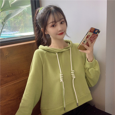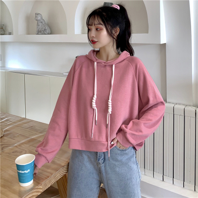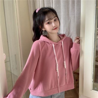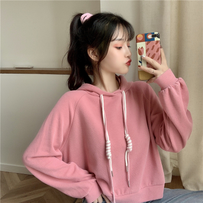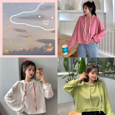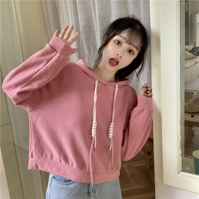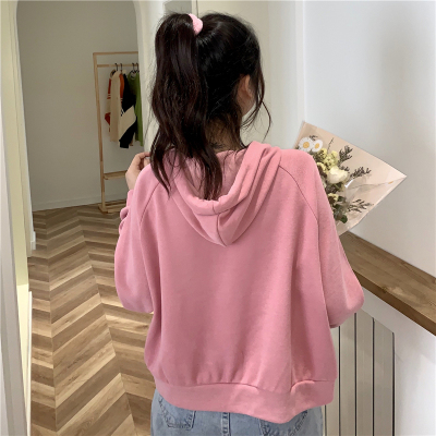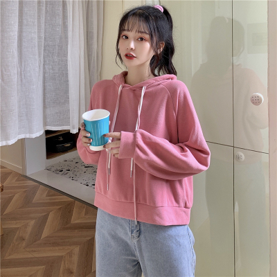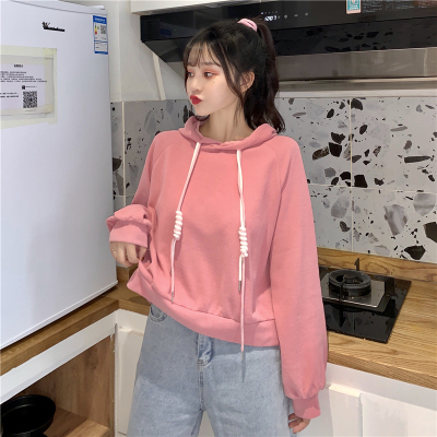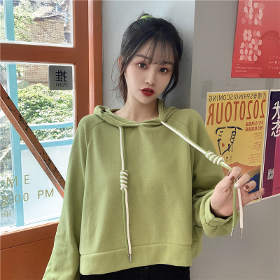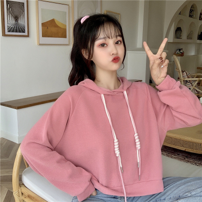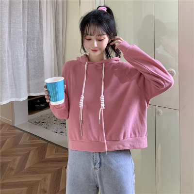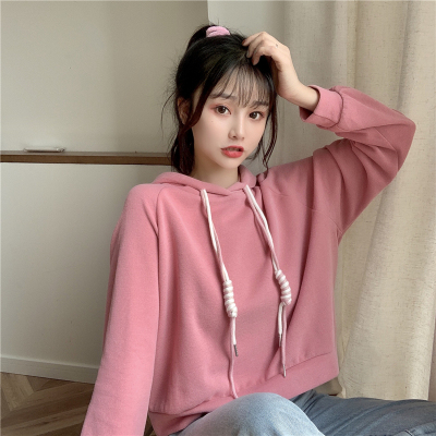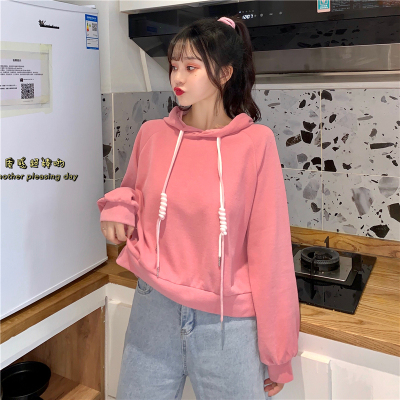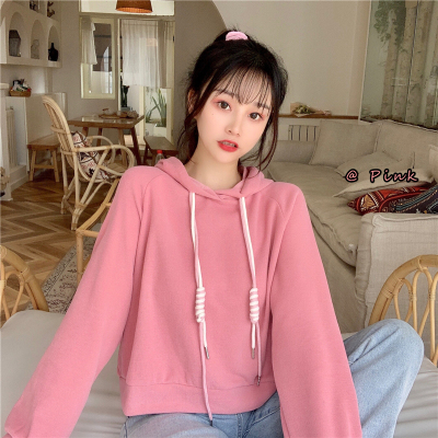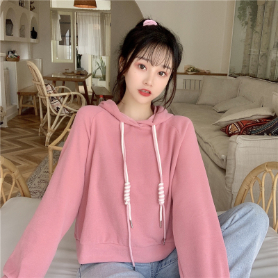 Real shot ~ Minnie cloth 7525 cotton ~ solid color hooded sweater women loose short style versatile autumn long sleeve top