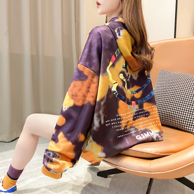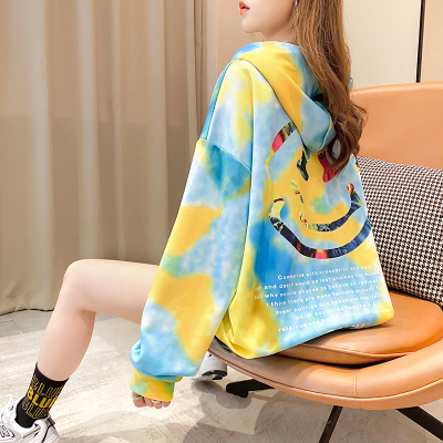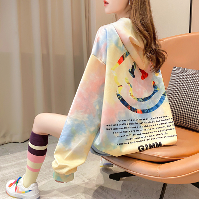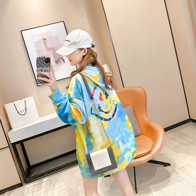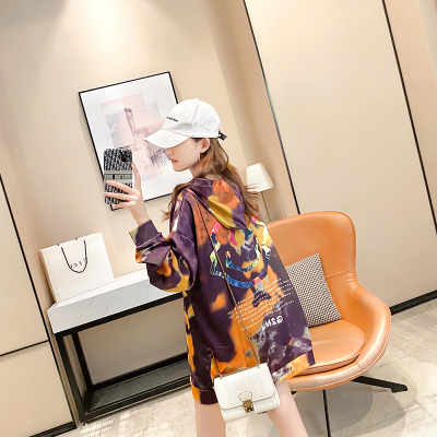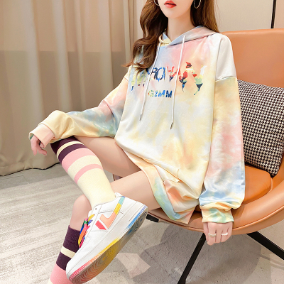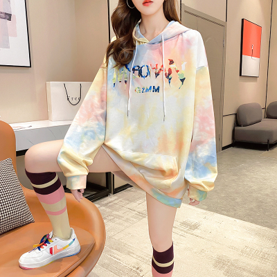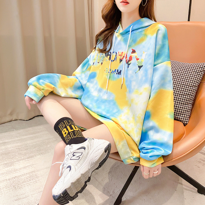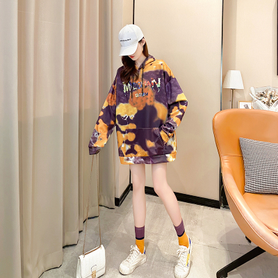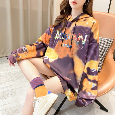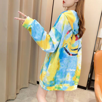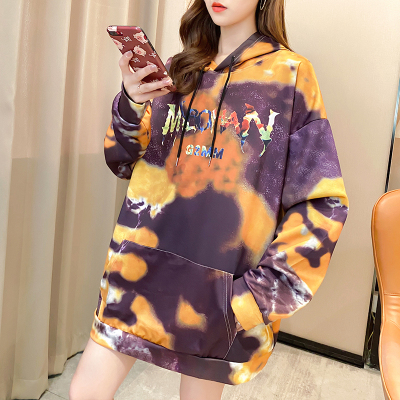 Real shot western style medium length printed hooded sweater women's loose Korean fashion tie dyed long sleeve coat spring and autumn thin