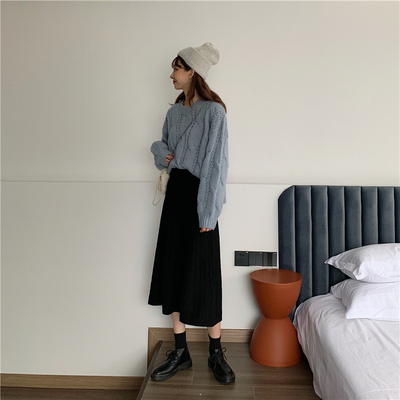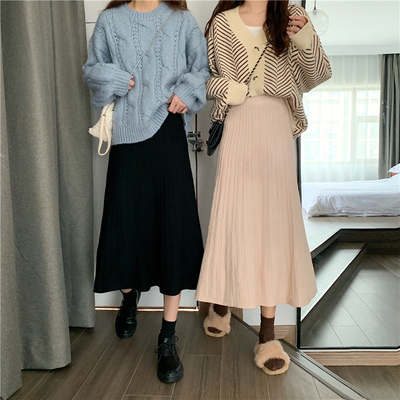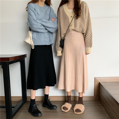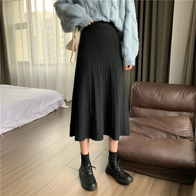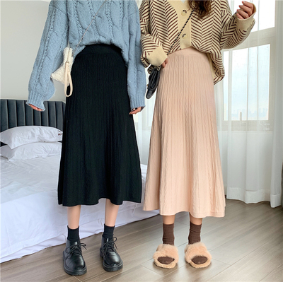 Korean version of INS super fire knitted skirt women's elastic waist mid length A-line skirt