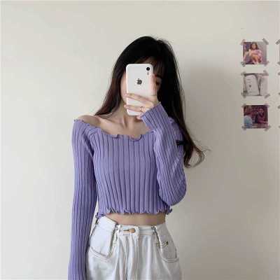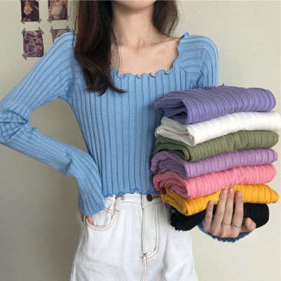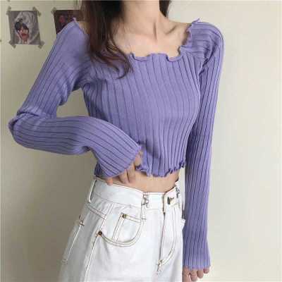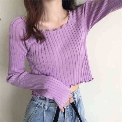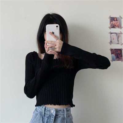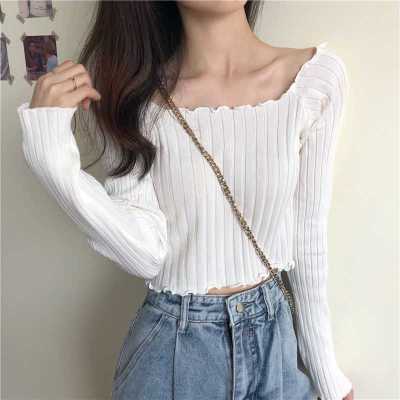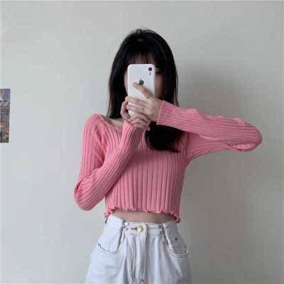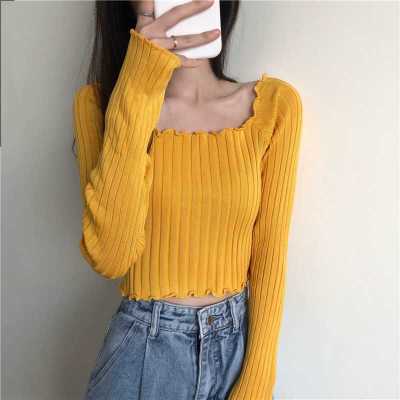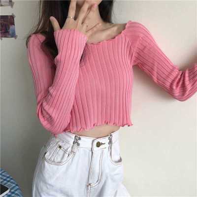 Early autumn 2020 new Korean version of small high waisted open navel top small square collar lace long sleeve sweater women fashion