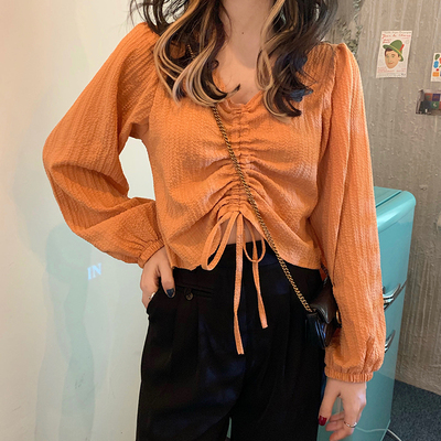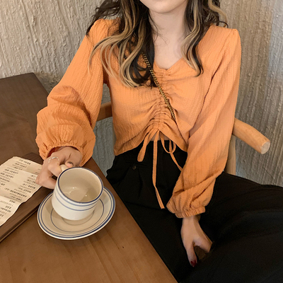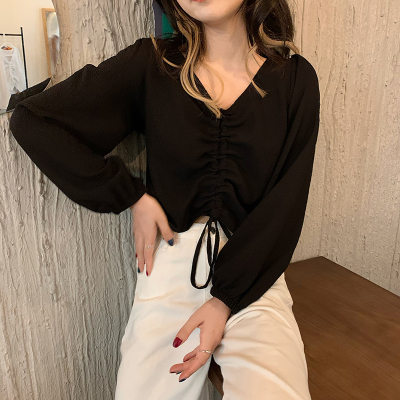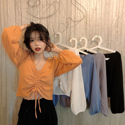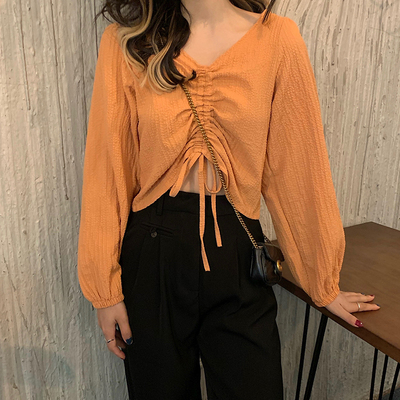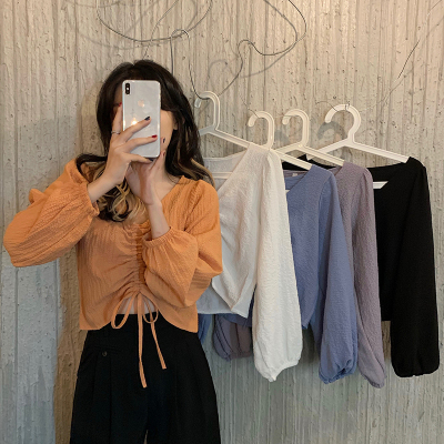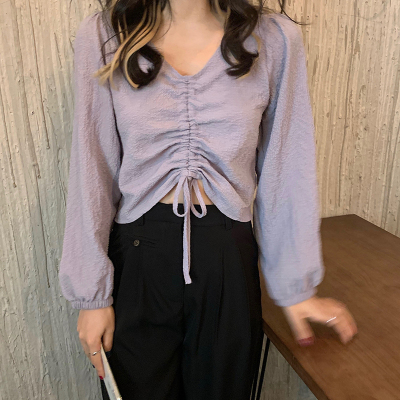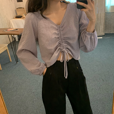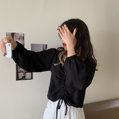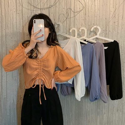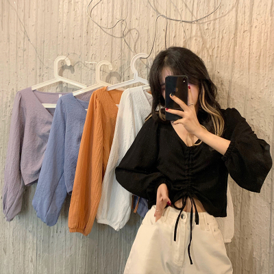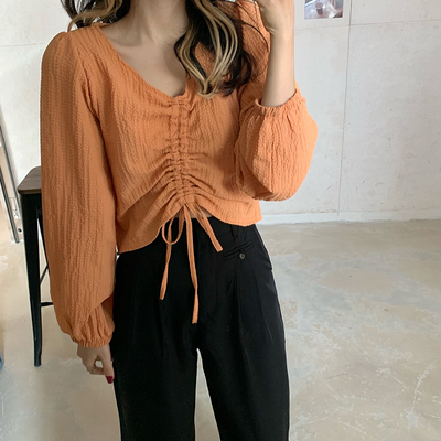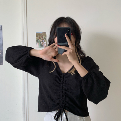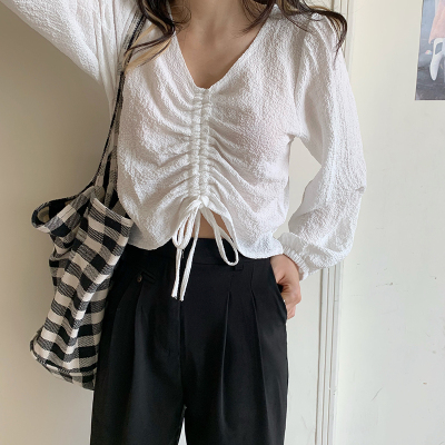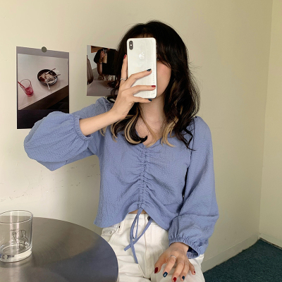 Real shot real price ~ bubble wrinkle shirt design sense drawstring short long sleeve top