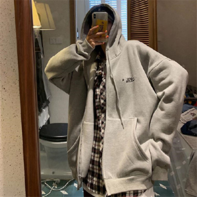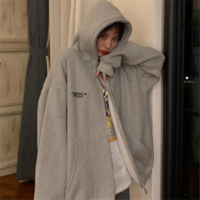Plush grey hooded Zipper Jacket Women's printed cardigan zipper jacket fashion
