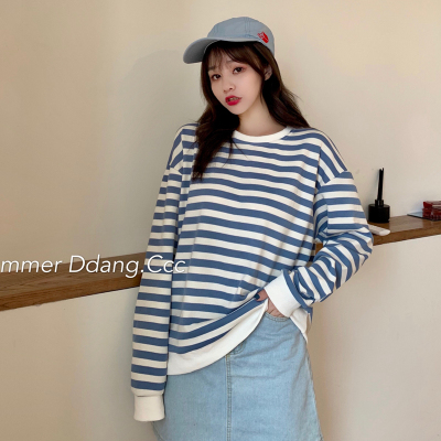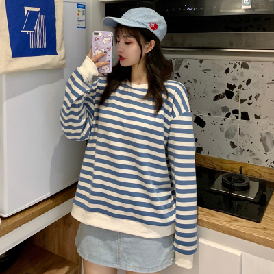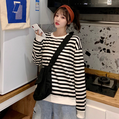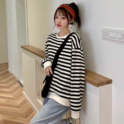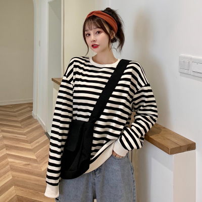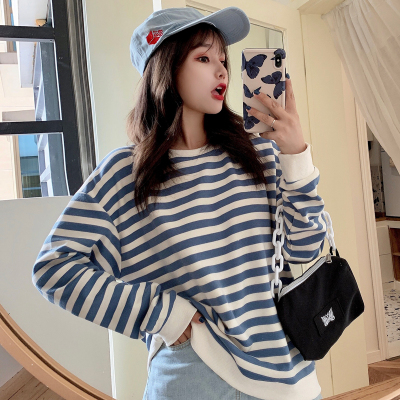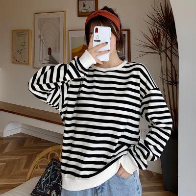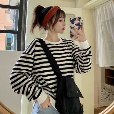 Real shot autumn dress new stripe versatile loose thin round neck long sleeve sweater women's 6535 fish scale