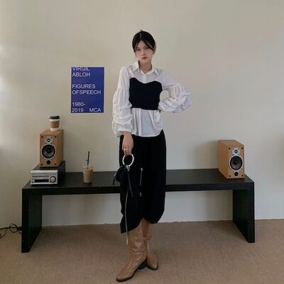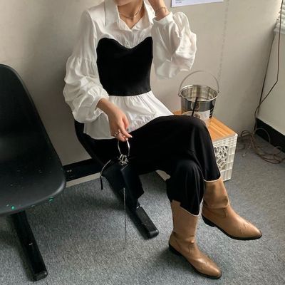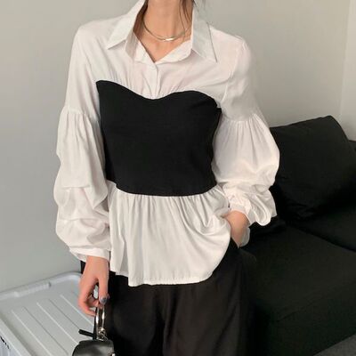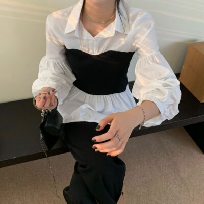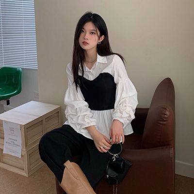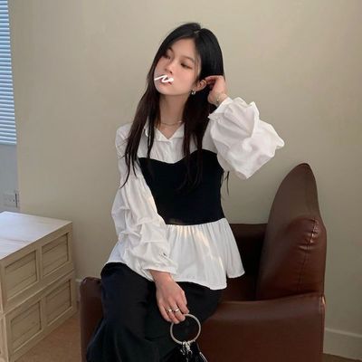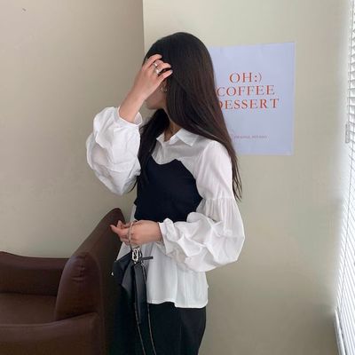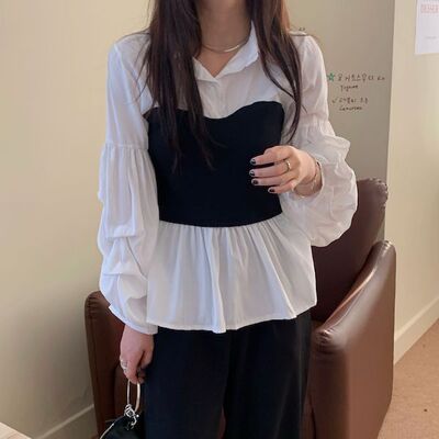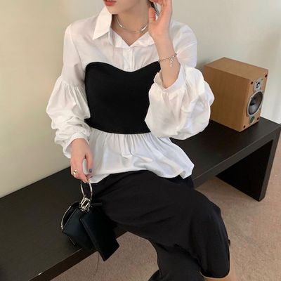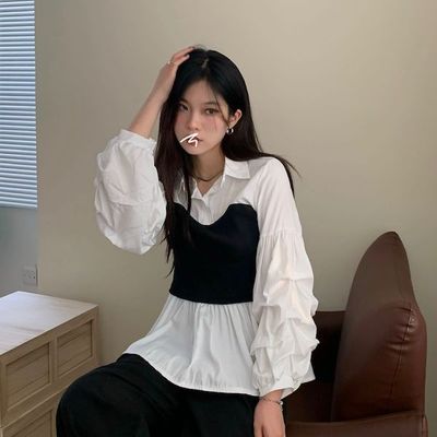 Real shot and real price design sense small number of fake two shirt top stitching knitted bubble Lantern Sleeve color contrast
