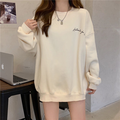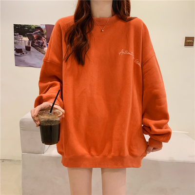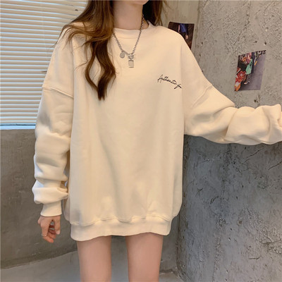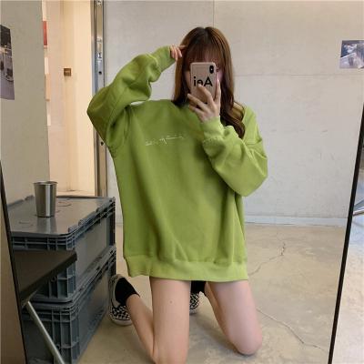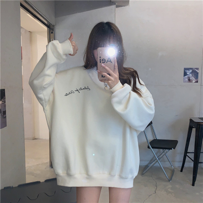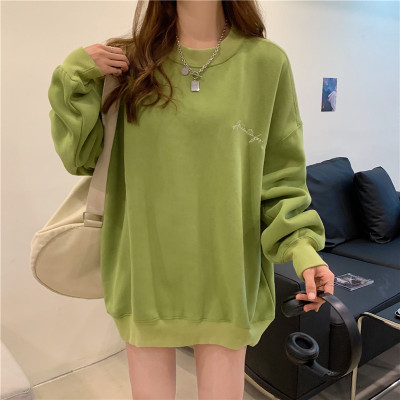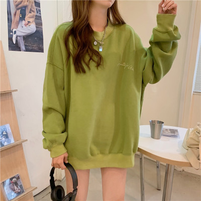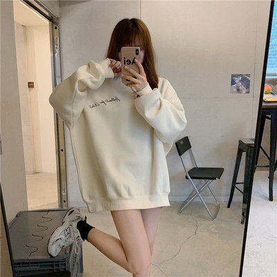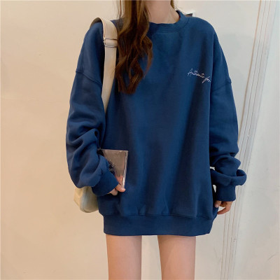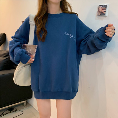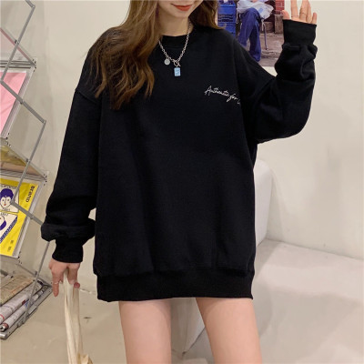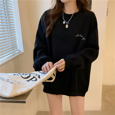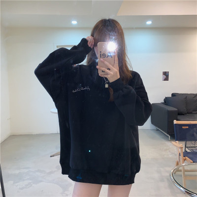Real shot lettered embroidery Plush sweater women's middle and long loose Korean casual top