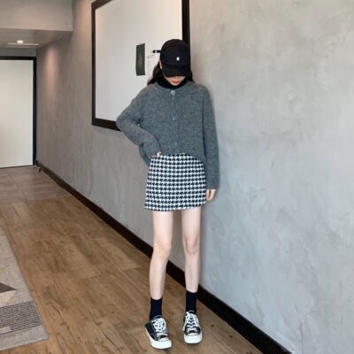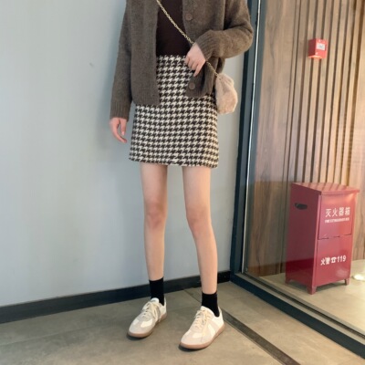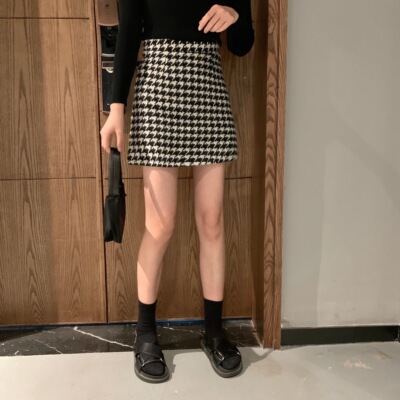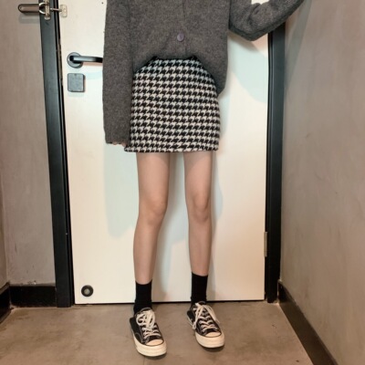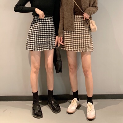Korean version of thousand bird Plaid woolen skirt short skirt with thin Plaid A-line skirt covering buttocks