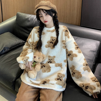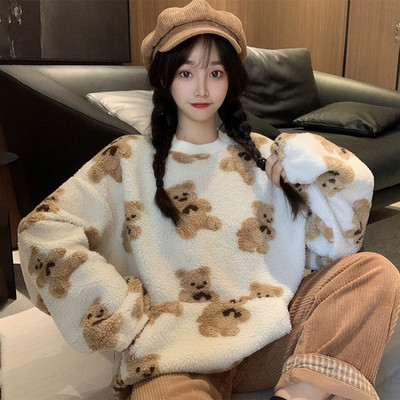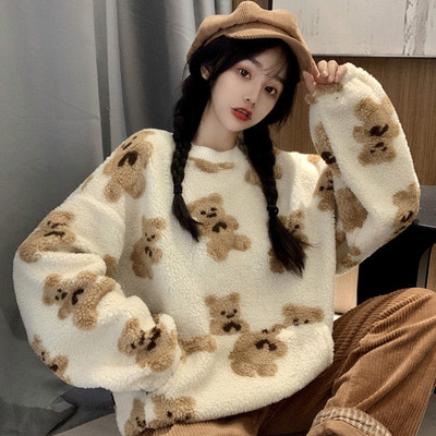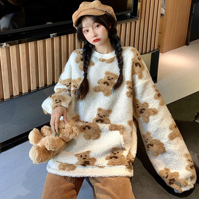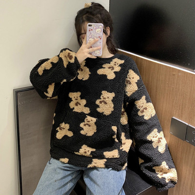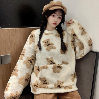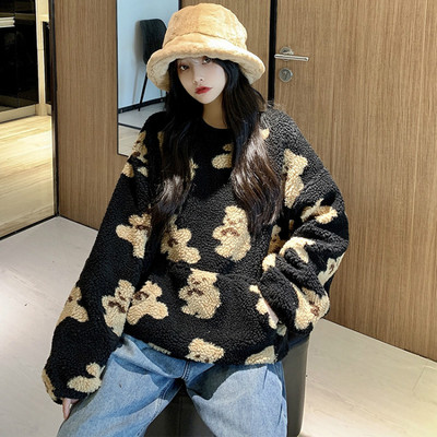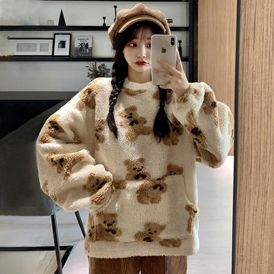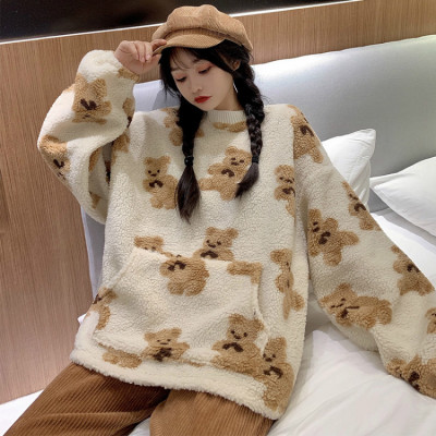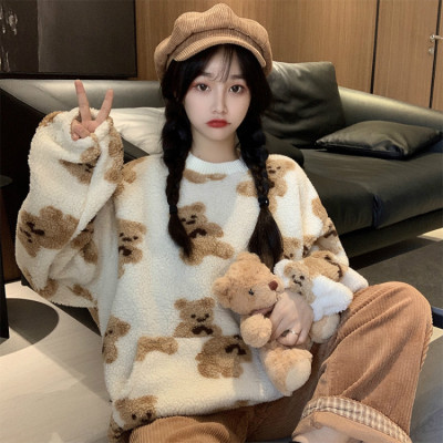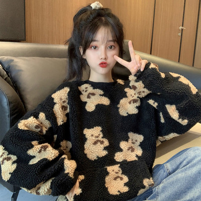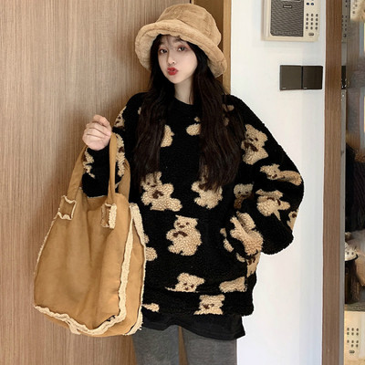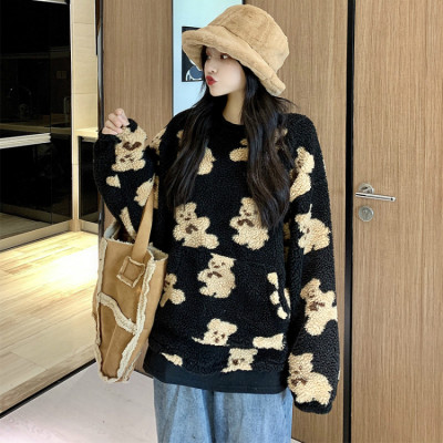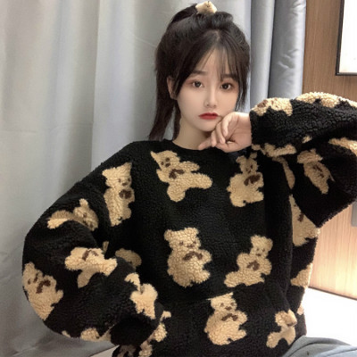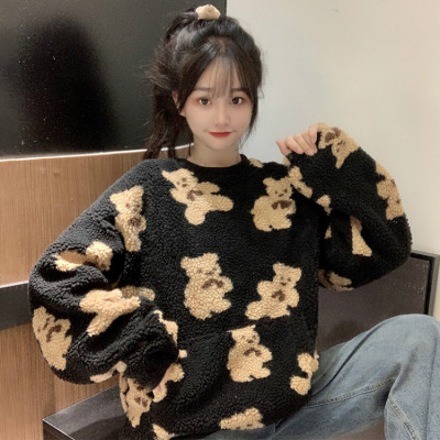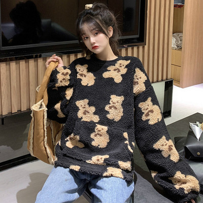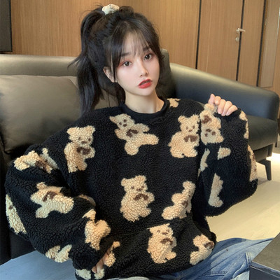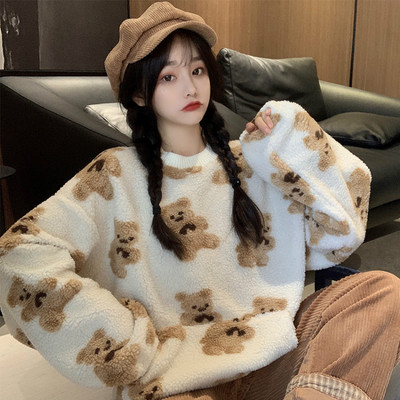 Real price shooting Korean loose lamb hair cute little bear design sense round neck slim Pullover long sleeve sweater