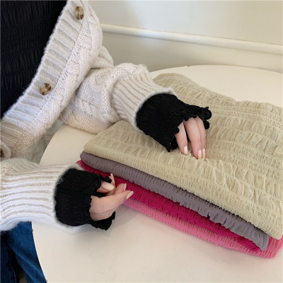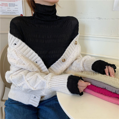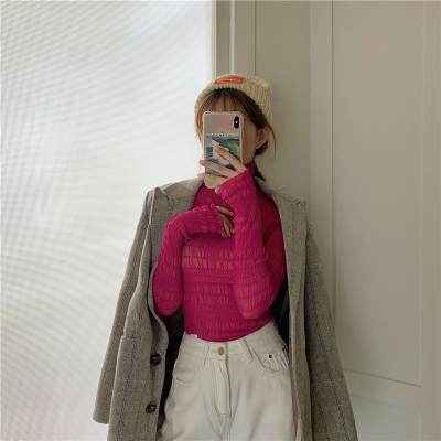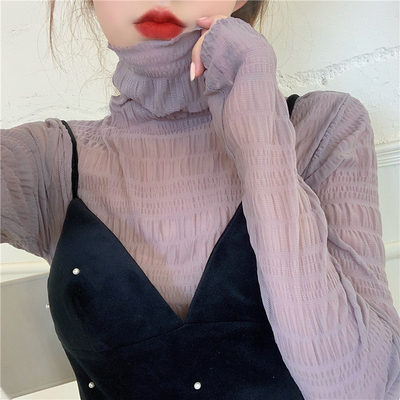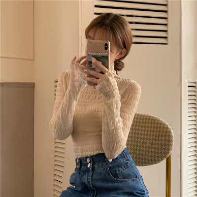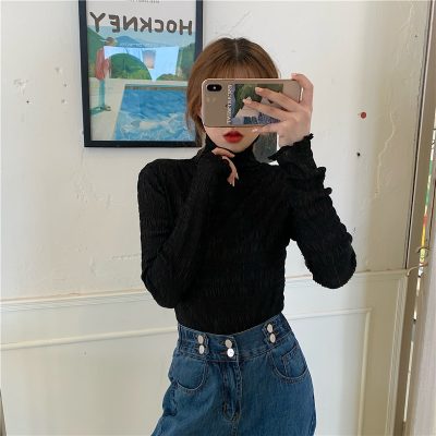 Real price black high collar lace bottomed shirt women's long sleeve with pleated push collar mesh top T-shirt
