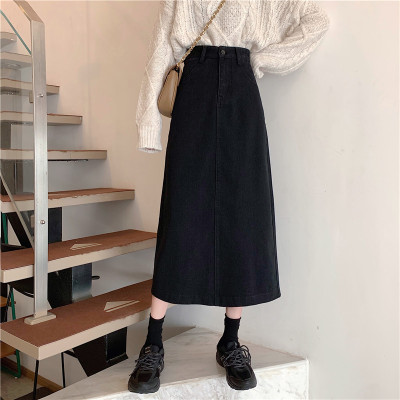 Real shot denim skirt autumn and winter women's new long skirt high waist show thin A-line skirt black skirt 3