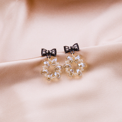 Real shot S925 silver needle black bow shape crystal Circle Earrings simple sweet lovely girl