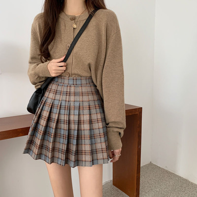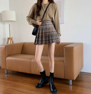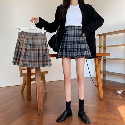 Japanese Plaid pleated skirt with high waist and thin A-line thickened skirt