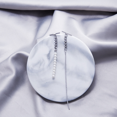Real shot 925 silver needle Japanese and Korean pearl chain long Tassel Earrings