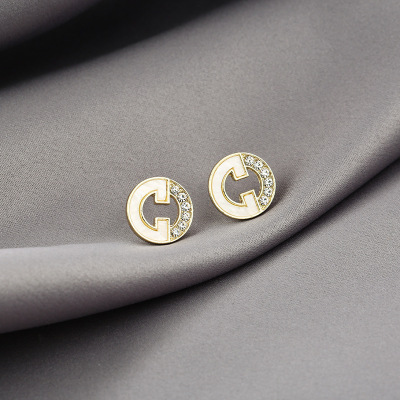Real shot silver needle small fragrant style hollow out Round Earrings female small French cold style letter Earrings