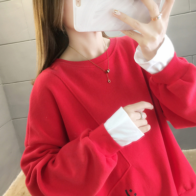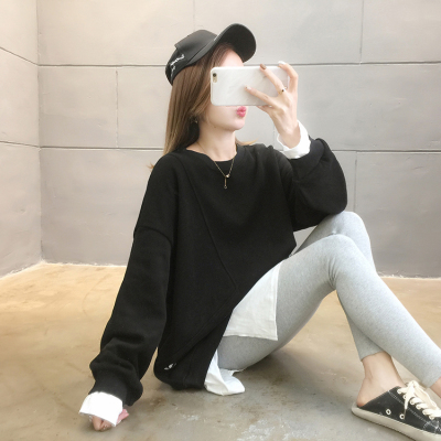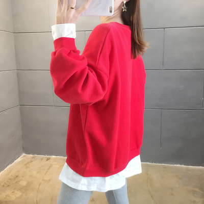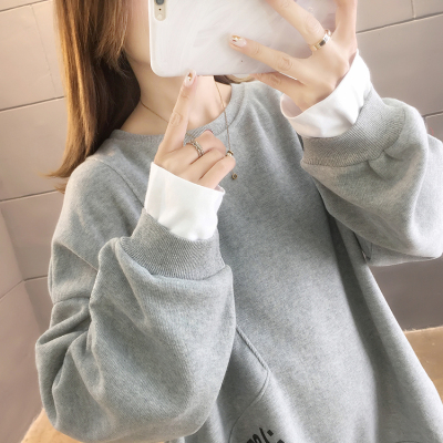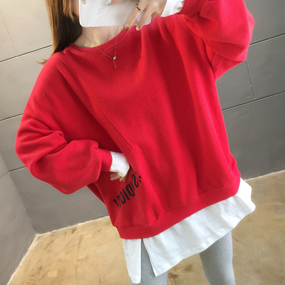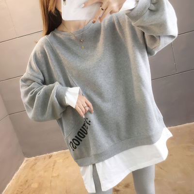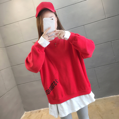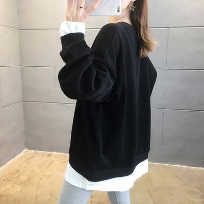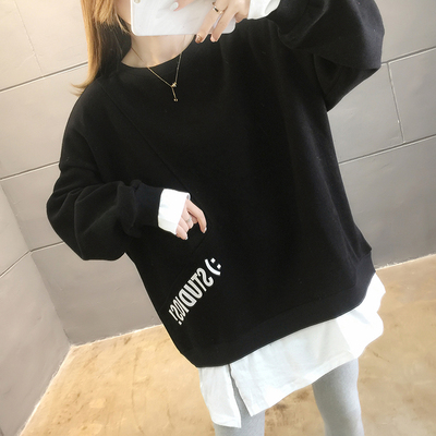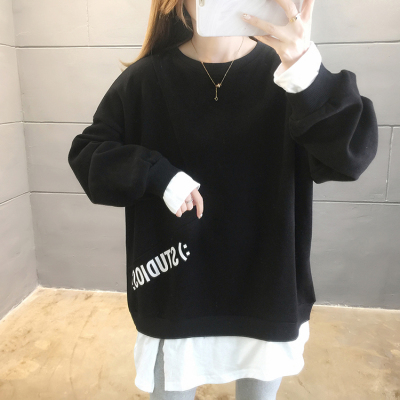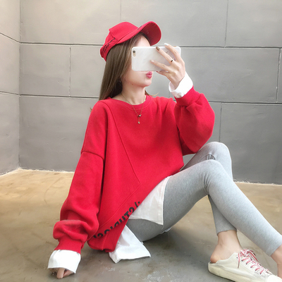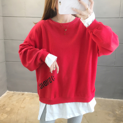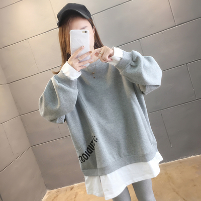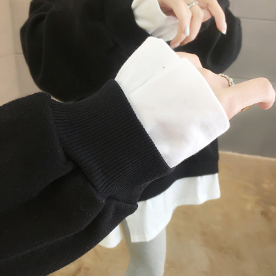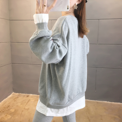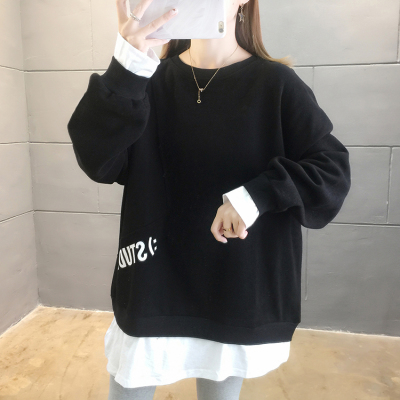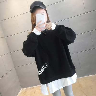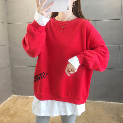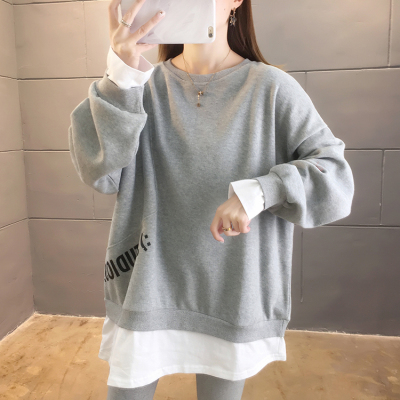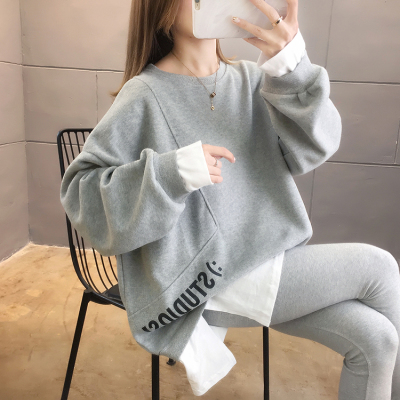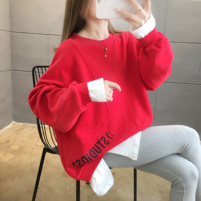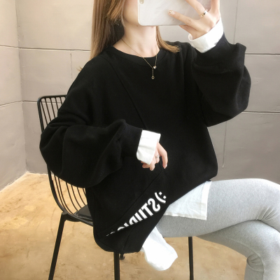 Real photo of 2021 Spring Dress ~ New fake two loose round neck fashion thin fat mm sweater women's tweed brush Plush