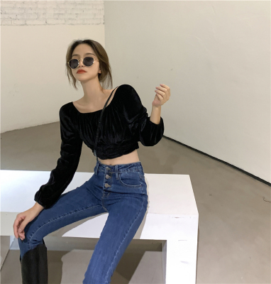 Real photo of early spring 2021 new style boudoir dress with retro gold velvet long sleeve dress