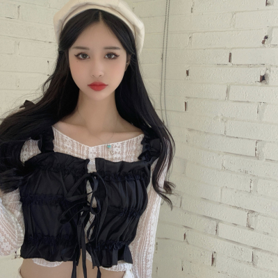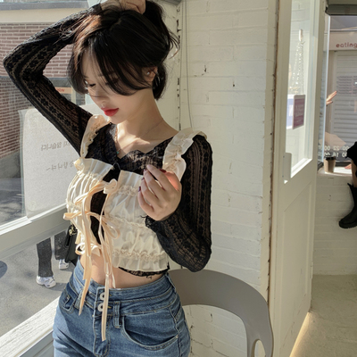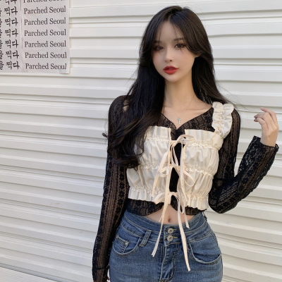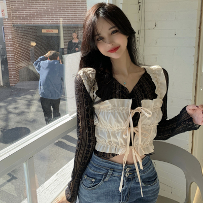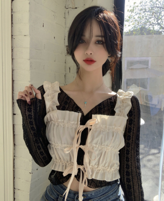 Real shot real price early spring Korean lace bottomed shirt + Ruffle suspender vest