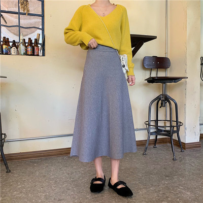 Real photo 2021 new versatile A-line design shows thin knitted skirt, wool skirt, high waist and medium length