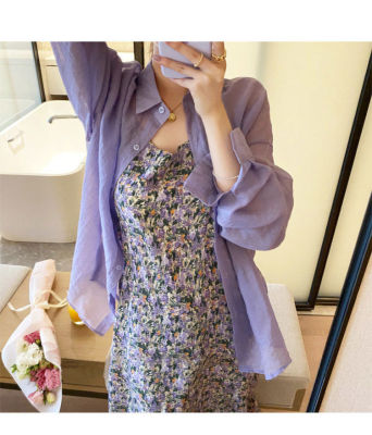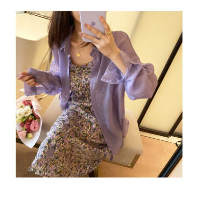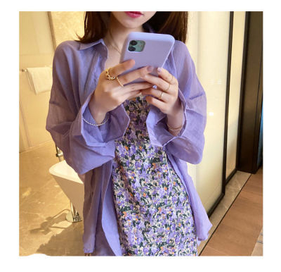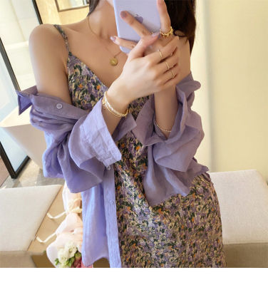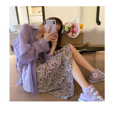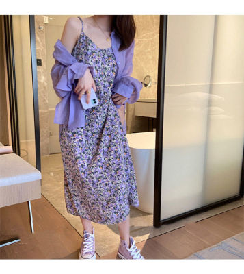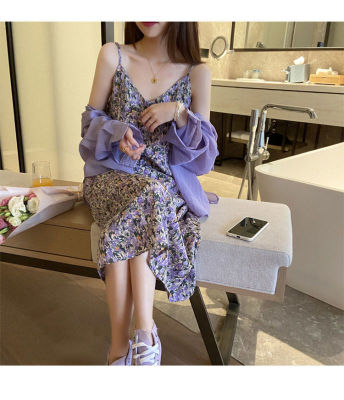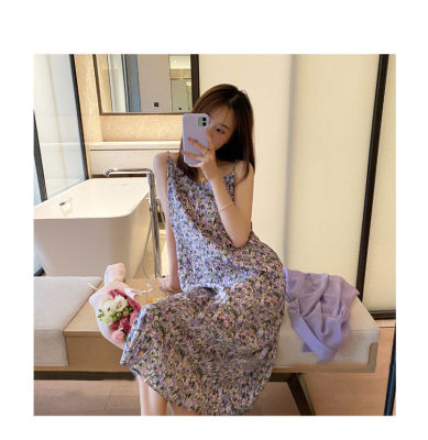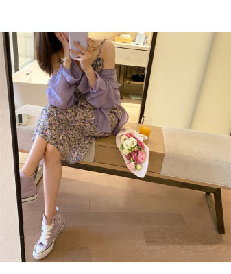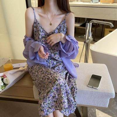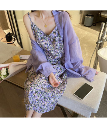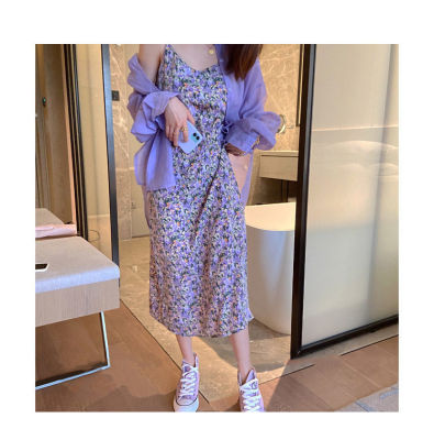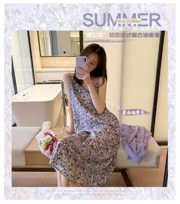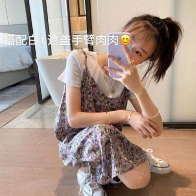 Suspender dress women's summer floral skirt sexy slim temperament retro collar oil painting purple word skirt