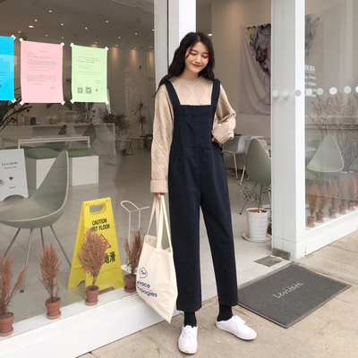 Real shot real price spring new Korean high waist loose tooling age reducing black suspenders