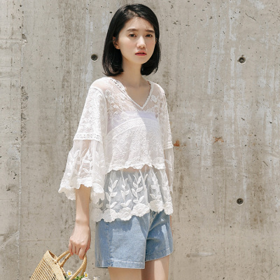 Real photo 2021 summer new holiday style embroidered lace shirt loose blouse retro small fresh top