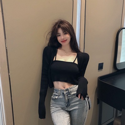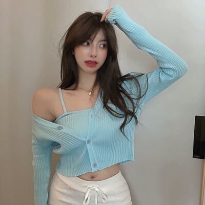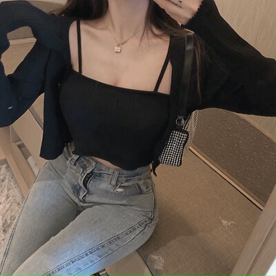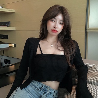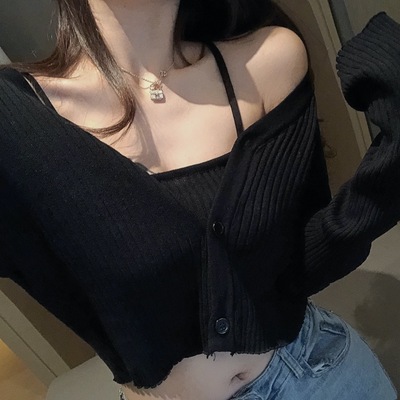 Real price 2021 new foreign style fashion suit women's long sleeve knitted cardigan temperament suspender vest two sets